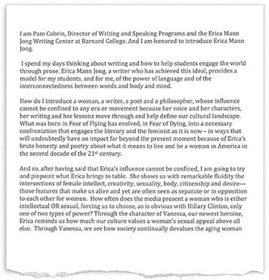 Pam Cobrin introduces Erica Jong at Barnard College
